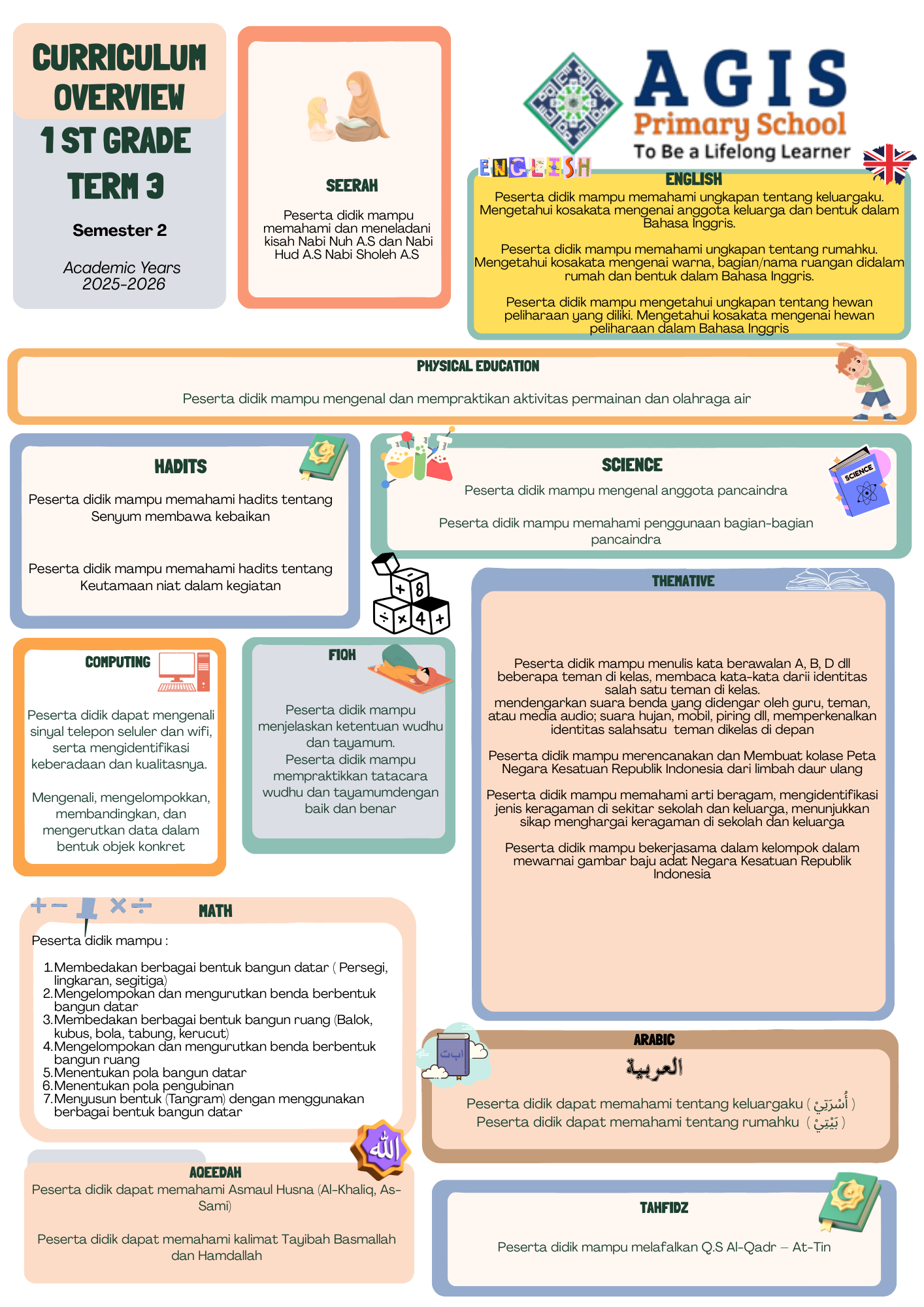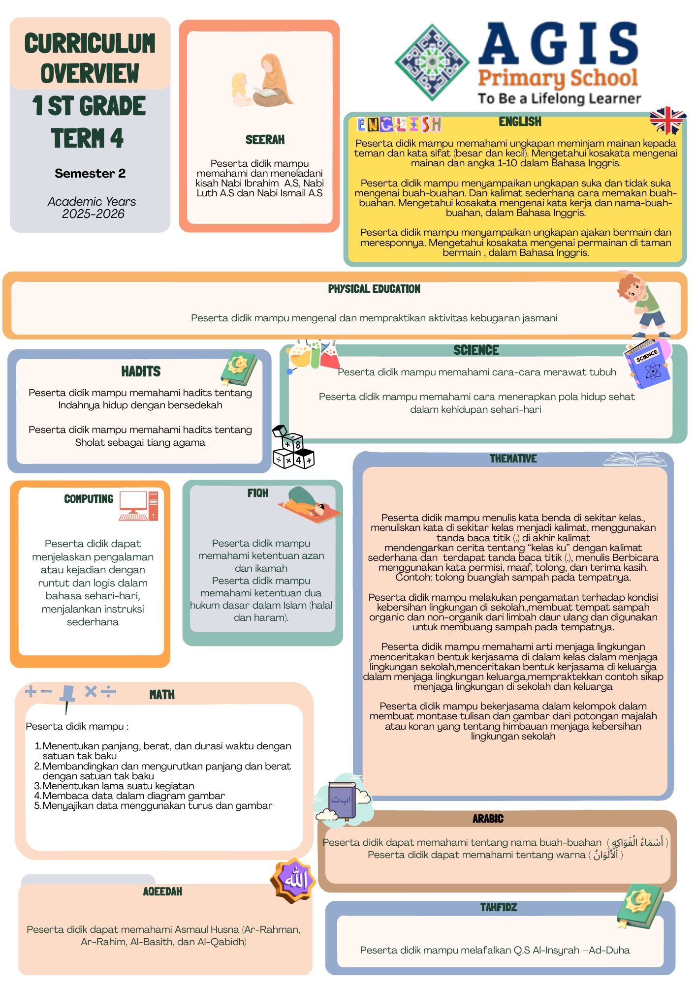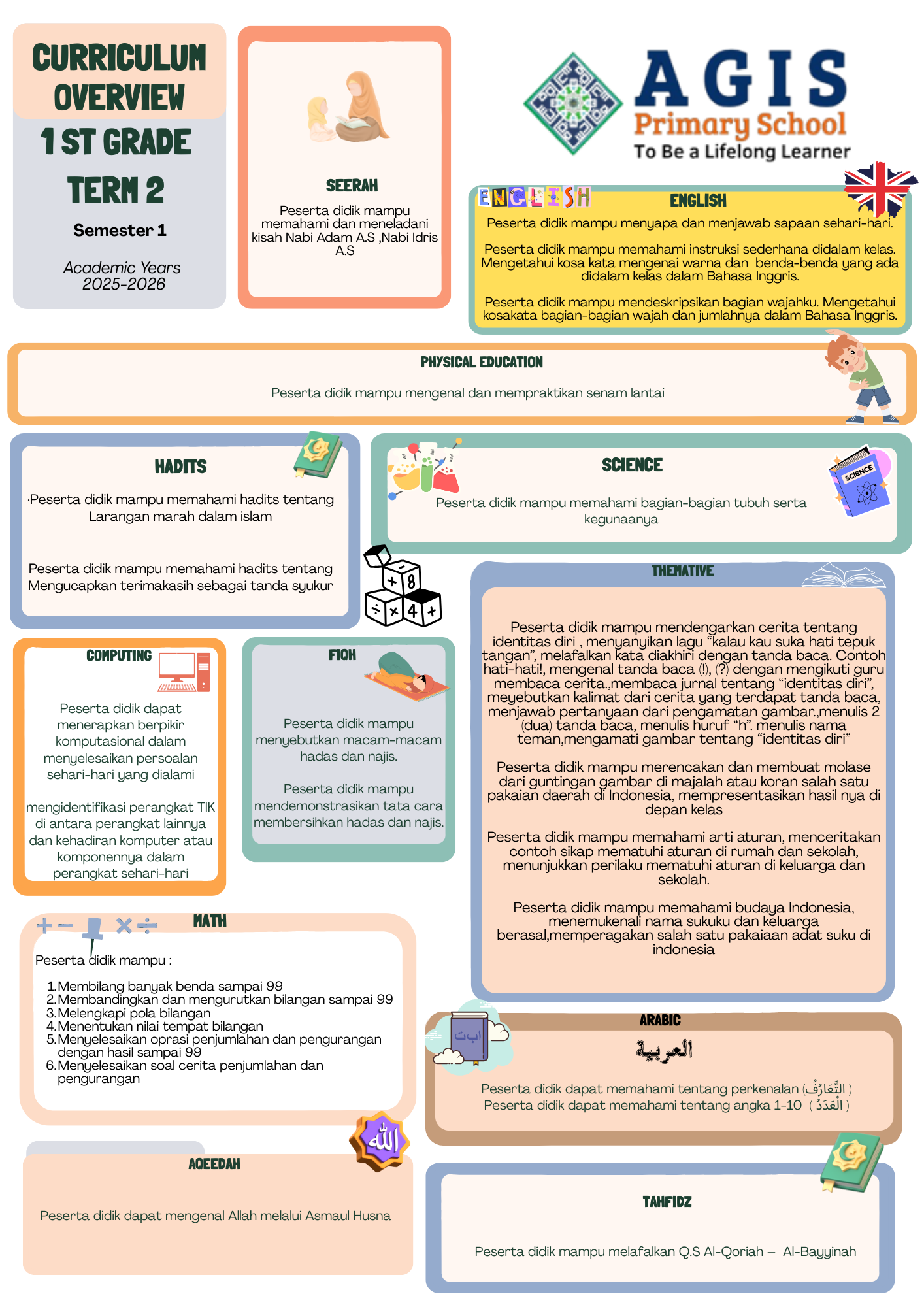 Gambaran umum rencana kegiatan pembelajaran kelas 1 yang meliputi ruang lingkup dan tujuan pembelajaran students untuk semester 1 dan 2 ditahun pelajaran 2025-2026 :